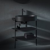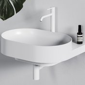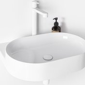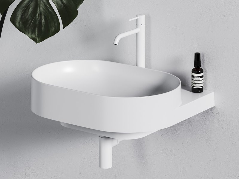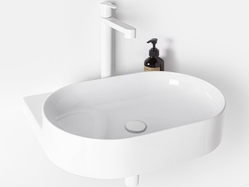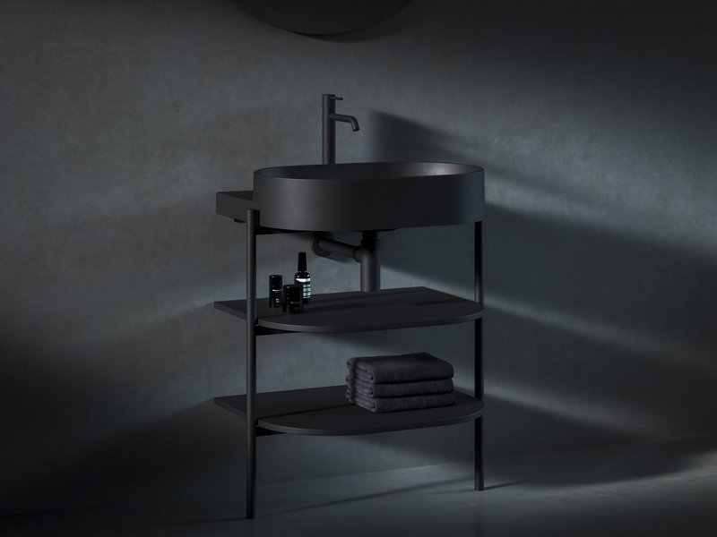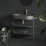 Ovālo izlietni papildina dizaina elements – balta, melna vai nerūsējošā tērauda konsole. Elegances burvība apvieno konsoli, jaucējkrānu, sifona galviņu un sifonu vienotā kombinācijā.
