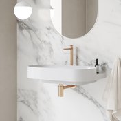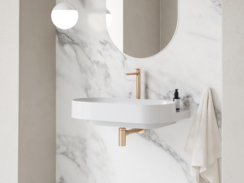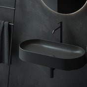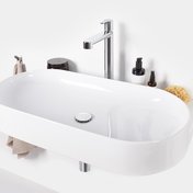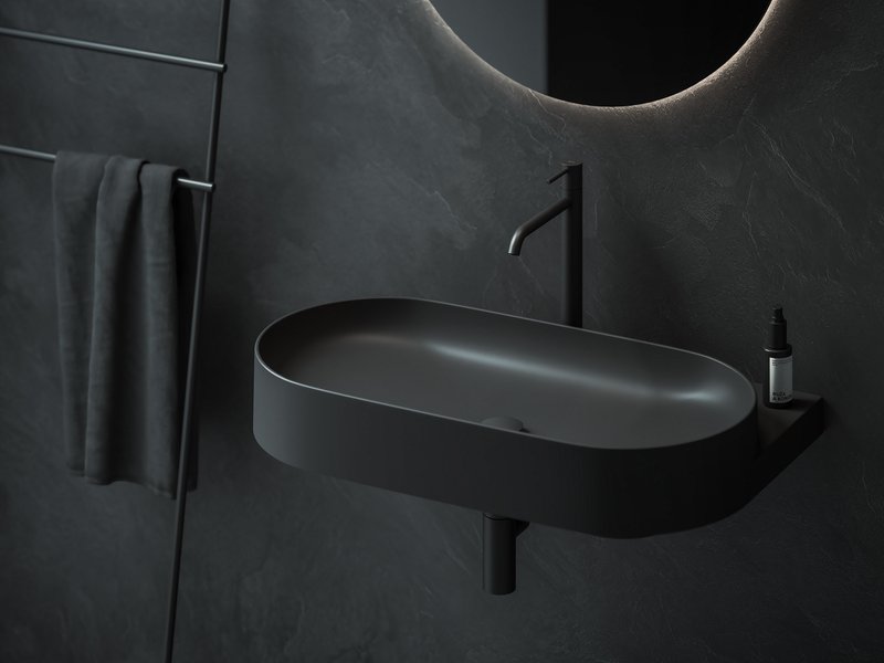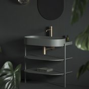 Ovālo izlietni papildina dizaina elements - balta, melna vai nerūsējošā tērauda konsole. Elegances burvība apvieno konsoli, jaucējkrānu, sifona galviņu un sifonu vienā kombinācijā.