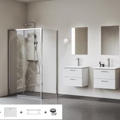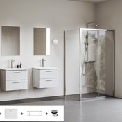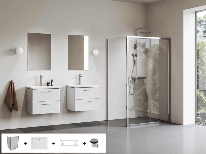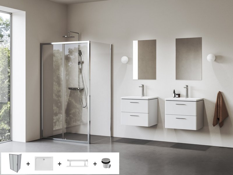 Komplektā ar pazeminātu cenu ietilpst Blix II stūra dušas kabīne spīdīgā krāsā, ar paliktni, balstu, apdares paneli un sifonu. Jūs varat izvēlēties starp diviem dušas kabīnes izmēriem: 100x80 cm vai 120x90 cm. Komplekta variants L/R nosaka kreiso vai labo pusi paliktņa paneļa uzstādīšanai.