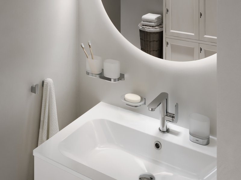 Turētājs ar ziepju trauku, Chrome II koncepcija, lieliski pielietojams vannas istabā ātrai roku mazgāšanai. Izstrādājums ir pieejams šādās krāsās: hroms vai matēti melnā.